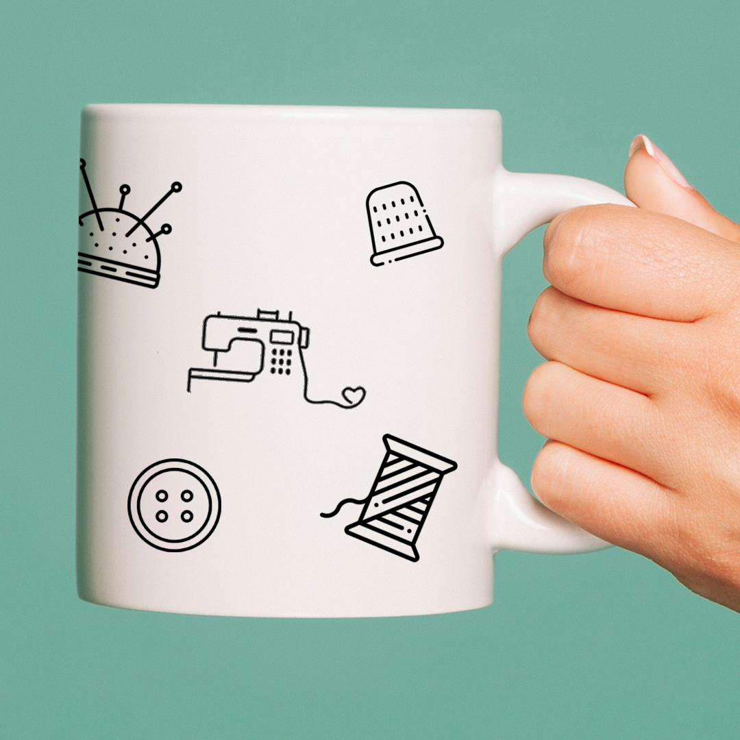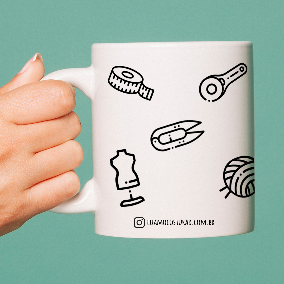 A caneca acompanha 10 elementos de costura impressos em detalhe preto com fundo branco. No rodapé da caneca tem o nosso instagram