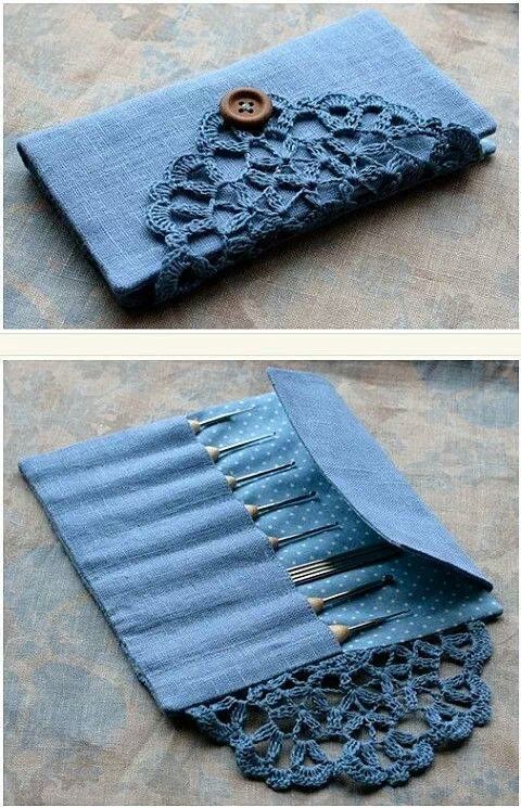 Gentem, olha que fofo é esse estojo com fecho de crochê para organizar agulhas..