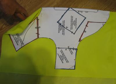 Após escolher o tecido, divida ele no meio, coloque o molde por cima e passe o giz